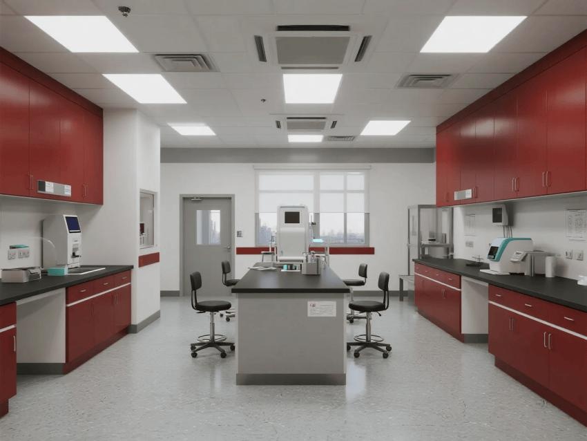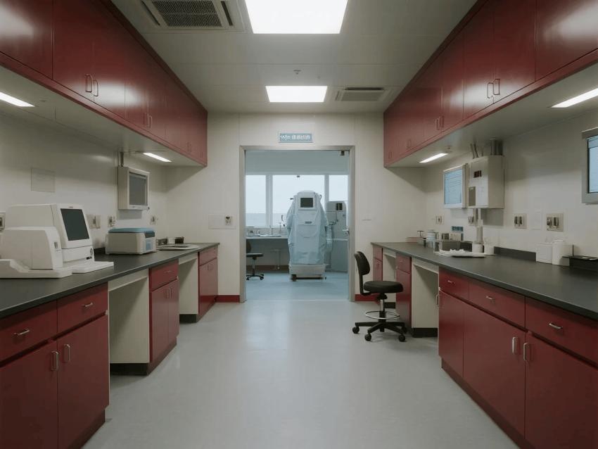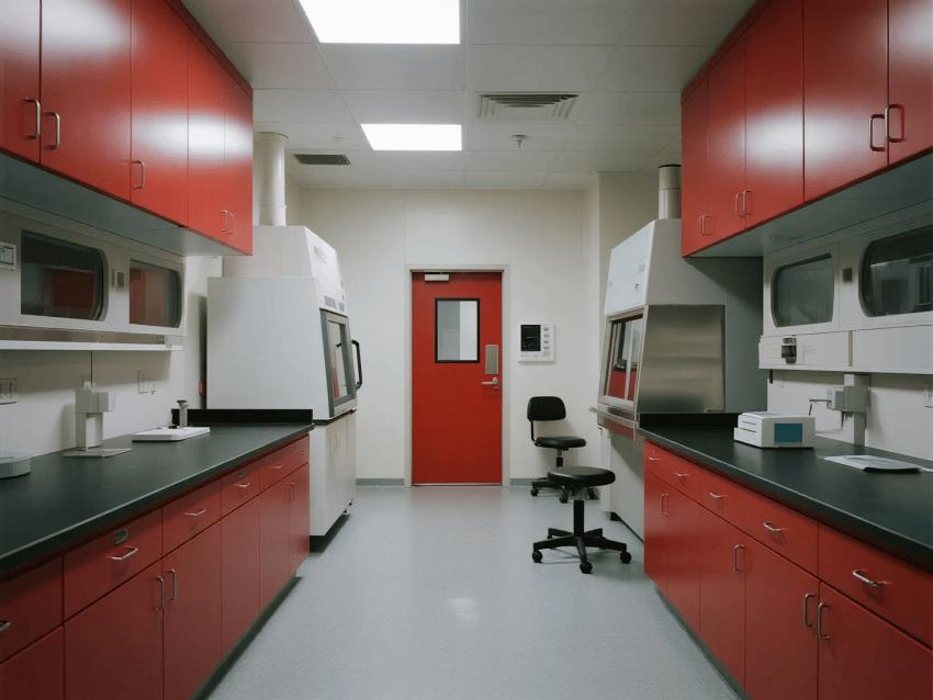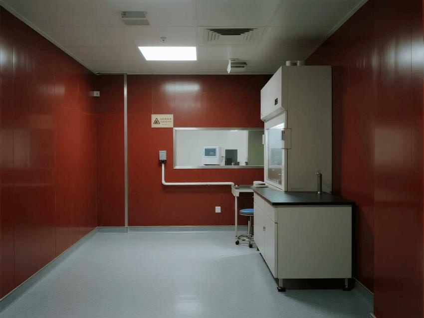 本實驗室嚴格遵循BSL-3級生物安全標準,通過深紅彩鋼板與淺灰環氧地坪的強烈視覺對比,構建安全高效的病原體研究空間。