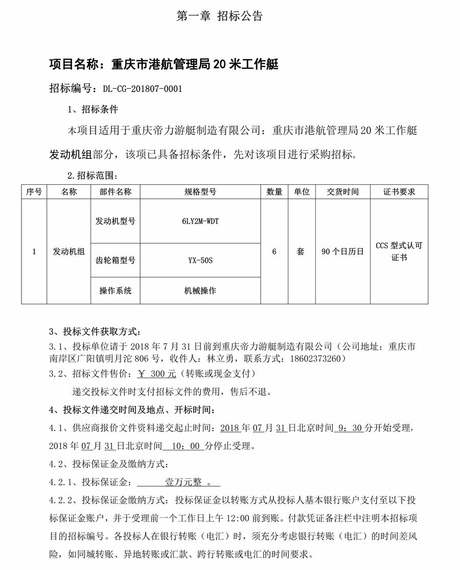重慶市港航管理局20米工作艇發(fā)動(dòng)機(jī)組招標(biāo)公告