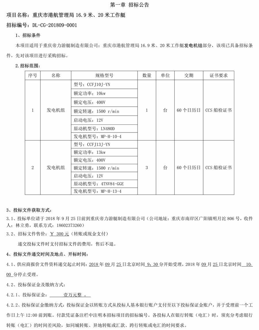 重慶市港航管理局16.9米、20米工作艇發(fā)電機組組招標公告