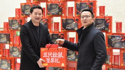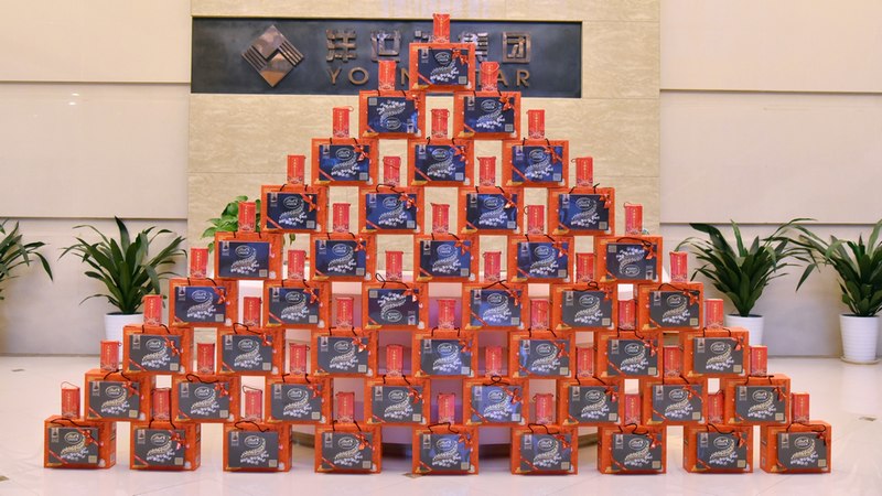 活動(dòng)現(xiàn)場,年貨禮品堆積成了一面厚重的“祝福墻”。